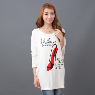 分享文 2015新款服飾-【維拉森林中大尺碼】白色高跟鞋圖案蝙蝠袖上衣
