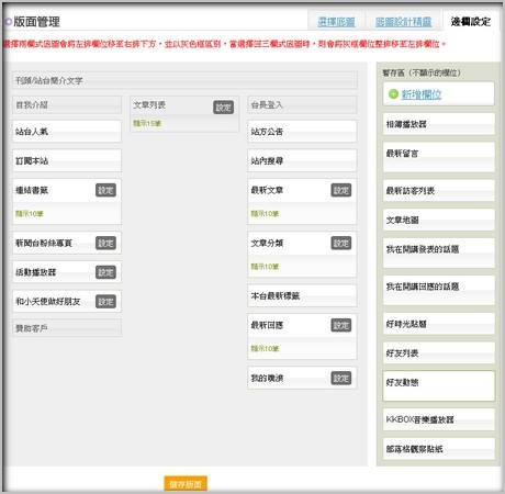 選擇兩欄式底圖的話,系統則會自動將原本三欄的左排欄位移至右排下方,但設想到您可能隨時又會選擇三欄式的底圖,所以開發小組貼心的把原本左方的欄位以灰色框區別,您一樣可以自由拖拉欄位至想擺放的位置。