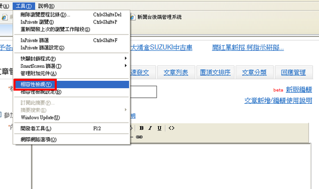 近日有收到會員反應編輯器功能列遺失問題,如您使用IE瀏覽器,請依照下圖將「相容性檢視」關閉,功能列即可恢復正常,或建議您改用其他瀏覽器。