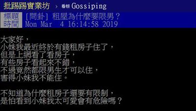 租屋限男她超困惑!網友一語點破關鍵台灣部分屋主認為女生比較乾淨,...