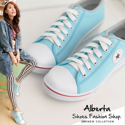 我在網路上搜尋之後,發現這一款產品【Alberta】百搭星星素色低筒綁帶休閒楔型厚底增高帆布鞋-平底鞋-亮色百搭 青春活力(水藍),看起來很不錯,價格也不貴(灑花!!)