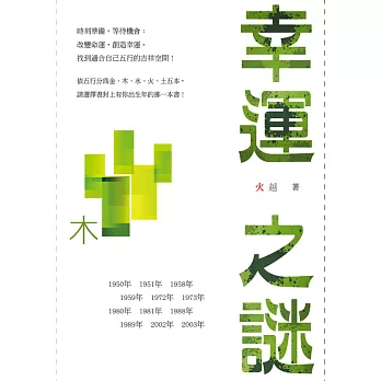 本書為《幸運之謎:木》,生命五行為「木」者的出生年有:1942年、1943年、1950年、1951年、1958年、1959年、1972年、1973年、1980年、1981年、1988年、1989年、2002年、2003年。(如沒有您的出生年,可用上述出生年加60數或減60數即為相同的生命五行)