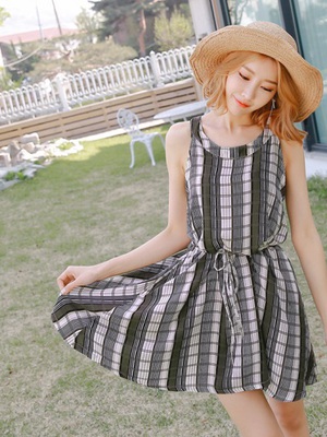 【2019流行商品】格紋配色雪紡微削肩綁帶長上衣-洋裝.2色-購買刷卡回饋