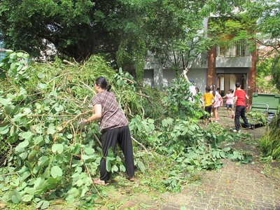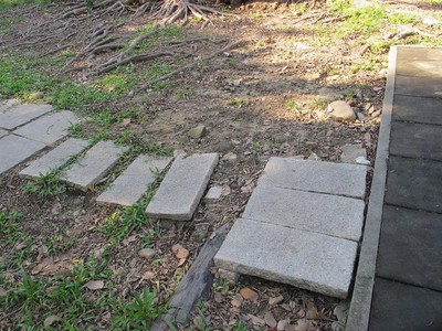 颱風過後,遊樂區往野餐桌區有許幾株豔紫荊的大樹倒塌,突起的樹根也將橫跨倒水溝的幾塊步道磚拱起。八月學校請園藝公...
