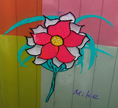 這是我在合作社的玻璃繪製的花朵,小蠟筆說看起來很像教堂上的圖案,布料彩繪筆的效果真的很不錯,也謝謝做美工的李先...
