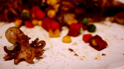 今天炒的小章魚特寫今天炒的小章魚特寫真希望牠還是活跳咷的加上冷凍的蘿蔔青豆做配菜用筷子夾起來做特寫我覺得拍這隻...
