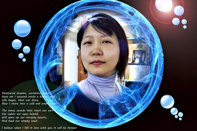 找個水晶的素材,再加點氣泡的素材,把老婆月置入水晶中,做出像水晶球的效果。