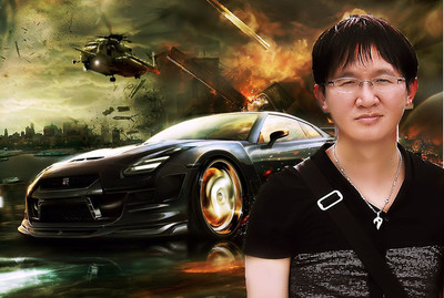 去找了一張背景很炫的相片做合成,有沒有像霹靂車裡的李麥克?^^這張背景有帥氣的跑車,和直昇機,在槍林彈雨中,特...