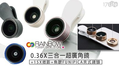 平均每入最低只要299元起(含運)即可享有Rainbow 0.36X三合一超廣角鏡(+15X微距+魚眼FUNIPICA夾式鏡頭)1入/2入/4入,顏色:黑/藍/玫瑰/金。