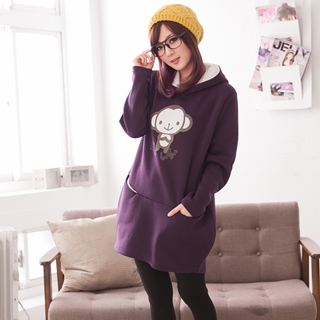 momo購物台,momo購物網:【衣心衣意中大尺碼】好搭保暖-刷毛可愛猴子口袋長版上衣(藍-紫FD5A5017)