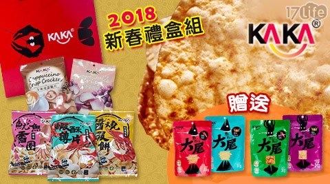 應該就是「 【KAKA】2018新春禮盒組任選5包50g+送原味30g(魷魚餅+魚酥條各1包) 」了