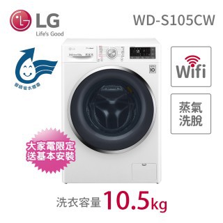 【生日禮物推薦】【LG 樂金】10.5公斤◆WiFi蒸氣洗脫滾筒洗衣機◆冰磁白(WD-S105CW)-2019爆紅商品