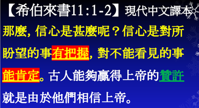 除了個人經歷外,也可以聽聽別人的見證(註四),聖經說:「我們既有這許多的見證人,如同雲彩圍着我們,就當放下各樣的重擔,脫去容易纏累我們的罪,存心忍耐,奔那擺在我們前頭的路程,」(來12:1)