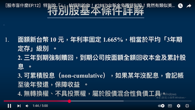今年台新金併了新光金之後,又出現一種特別的特別股,也就是「台新新光辛特」(2887I),它的特別在於3年到期強制贖回,這點和其他特別股不一樣,但和債券很像,只是利息有點低。(https://www.youtube.com/watch?v=s5yjlLGklMk)( https://www.youtube.com/watch?v=e6CfufgPAjI)