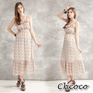 【Chcoco】長洋裝-小碎花細肩繞脖雪紡洋裝(米)
