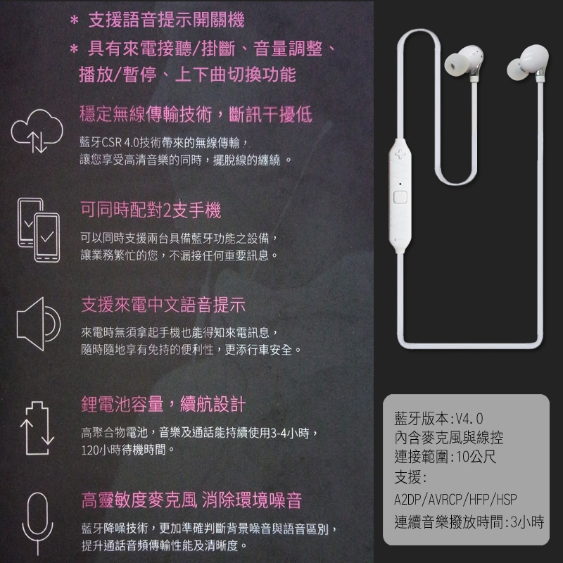無線運動型藍牙耳機,人體工學技術,極致輕量,輕便配戴,支援一對二功能,可同時配對兩支手機!