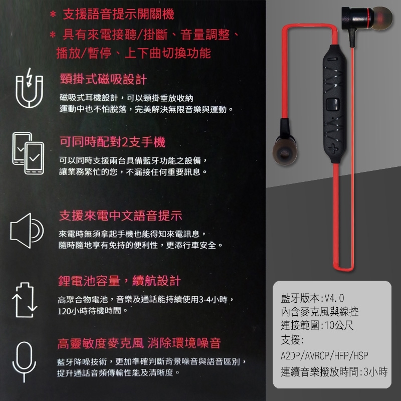 運動不孤單,輕鬆聽音樂!後掛式磁吸設計,輕便配戴,支援一對二可同時配對兩支手機;支持語音播報來電號碼/語音提示開關機