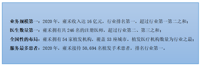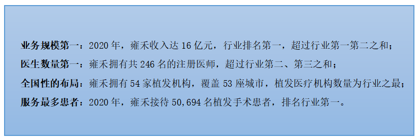 雍禾醫療作為領域內最早期的入局者之一,先發優勢顯著。按照2020年營業收入計算,雍禾醫療以14.13%的市場份額位居行業第一,超過行業第二、第三名競爭者之和;此外,雍禾醫療在醫生數量、植髮醫療機構數量以及植髮患者人數這三項關鍵指標均位列中國植髮行業第一。