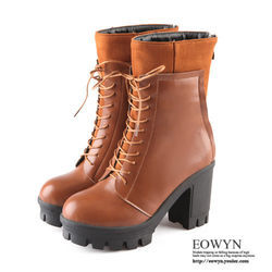 EOWYN.時尚顯瘦款圓頭綁帶拼接粗跟高跟短靴EMD03048-81-4色-34-39碼現貨+預購