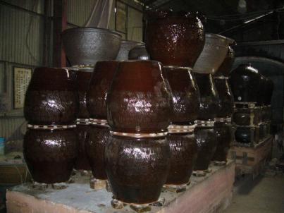 溫窯後再經過約14小時溫度慢慢調升至1200多度,關掉瓦斯降溫; 等了2~3天的時間,窯溫約剩100多度就可以出窯了~拉出第一台窯車,開始將陶甕等搬下車台, 咦?缸中缸?疊窯時沒拍到,真是失職ㄚ~...