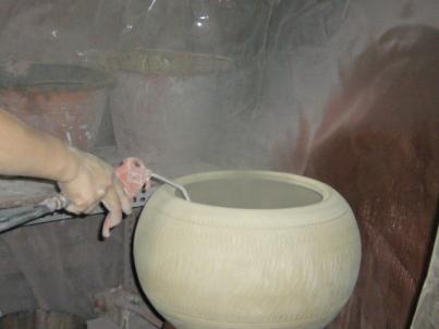 上釉了,用空氣壓縮機+噴槍先將夯爐裡的粉屑噴出,蓋上蓋子,(因夯爐裡面不用上釉)先噴一層黑色釉黑色釉噴好再換噴白色釉再噴一次噴好了,以調色盤的原理~黑+白=灰,但釉色的變化是多一分黑或白,燒出的顏色就...