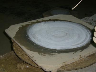 板模上抹水,再灑上一些石灰放上揉好的陶土拍打實貼些灑些水,開始拉坏~~~ 中間的漣漪紋路很漂亮!中心點拉出一個洞再灑些水,繼續將中間的口拉開越來越大~~~~再大~~~還不夠~~~~ 請接續~五...