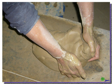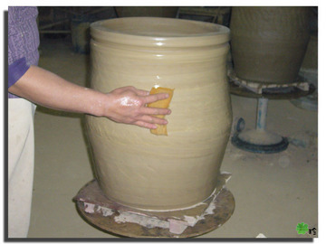 已達70~80%乾的硬度;可進行修胚,先用海綿吸水,將表面陶土抹濕,內外均要抹濕,拿工具輔助修胚,將胚體厚薄拍...