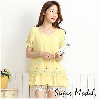[名模衣櫃]氣質典雅 珠飾蕾絲圓領雪紡上衣-珠黃FREE珠黃 ♥省很多♥