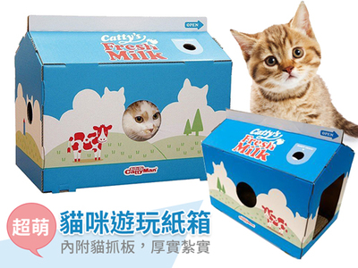 可愛系牛奶盒造型貓咪遊玩紙箱,內附貓抓板,造型可愛,貓咪開心主人愉快!