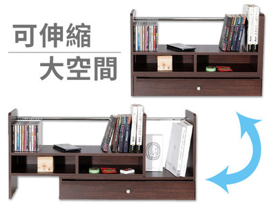 受不了桌上一片凌亂嗎?你需要一個更聰明的書架,讓書本、文件、小物有各自的家,有別於一般的書架,伸縮設計可聰明的延伸收納空間,精緻收納抽屜,可將小物收藏整齊。台灣生產製造,品質有保障!實心塑合板,貼合 PVC皮。寬度可由62cm延伸至120cm,伸縮設計,空間運用更方便。