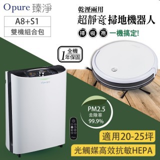 【最多人購買】【Opure臻淨】A8 物聯網光觸媒高效抗敏HEPA 空氣清淨機+S1乾濕兩用超靜音掃地機器人(超值組合)-居家用品