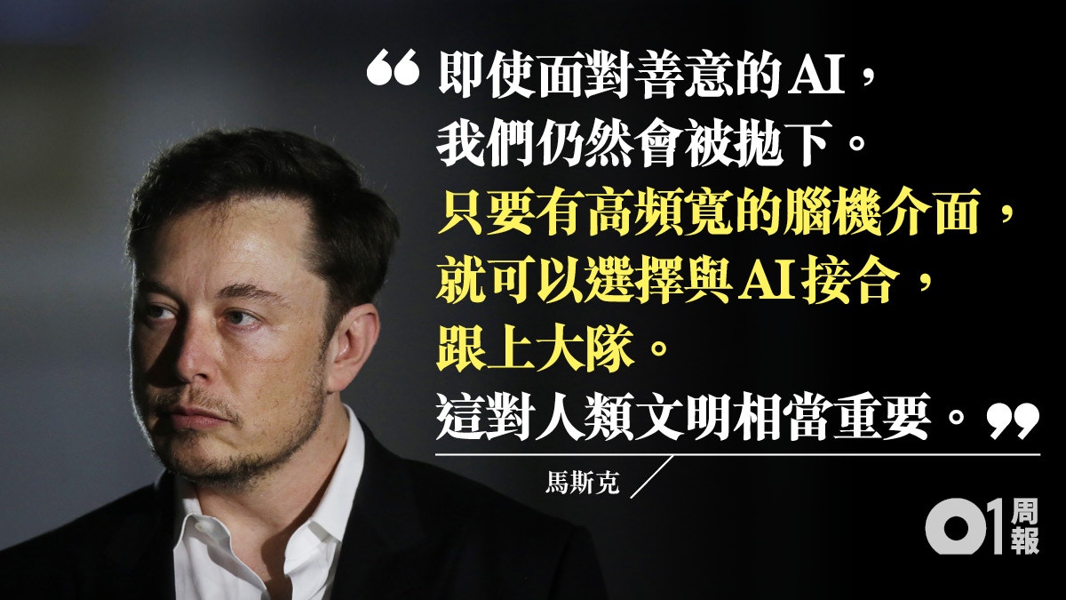 馬斯克認為人人已是半機械人。而隨人工智能(AI)崛起,他認為人腦必需突破自身限制,他的公司Neuralink正研究以「腦機介面」(Brain-Computer Interface)來達成。