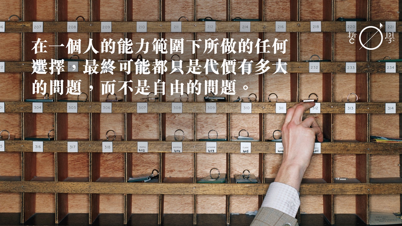 (二) 意志的往往通過選擇來表達,而選擇則以機會成本(opportunity cost)多少來衡量意志是否清楚堅決,所以,在一個人的能力範圍下所做的任何選擇,最終可能都只是代價有多大的問題,而不是自由的問題。比如打工仔要供樓,所以要保住工作,所以一定要聽老闆的話,所以他沒有自由意志。但如果他決心準備好付出瞓街的代價,他仍然有自由選擇不聽老闆的話。(這點可能與(一)又有矛盾)所以,最後可能不是有沒有自由意志的問題,而是意志有多強、多堅決,願意付出多少代價的問題。