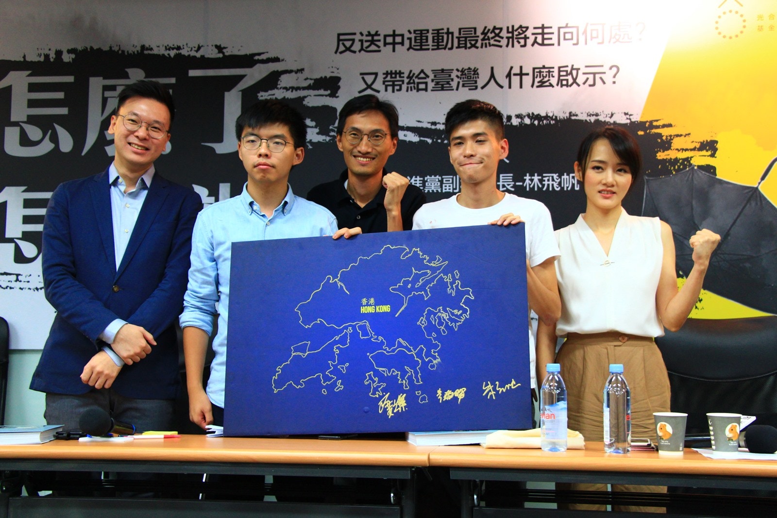 香港「眾志」秘書長黃之鋒(左二)曾赴台,呼籲民進黨制定《難民法》。(中央社)