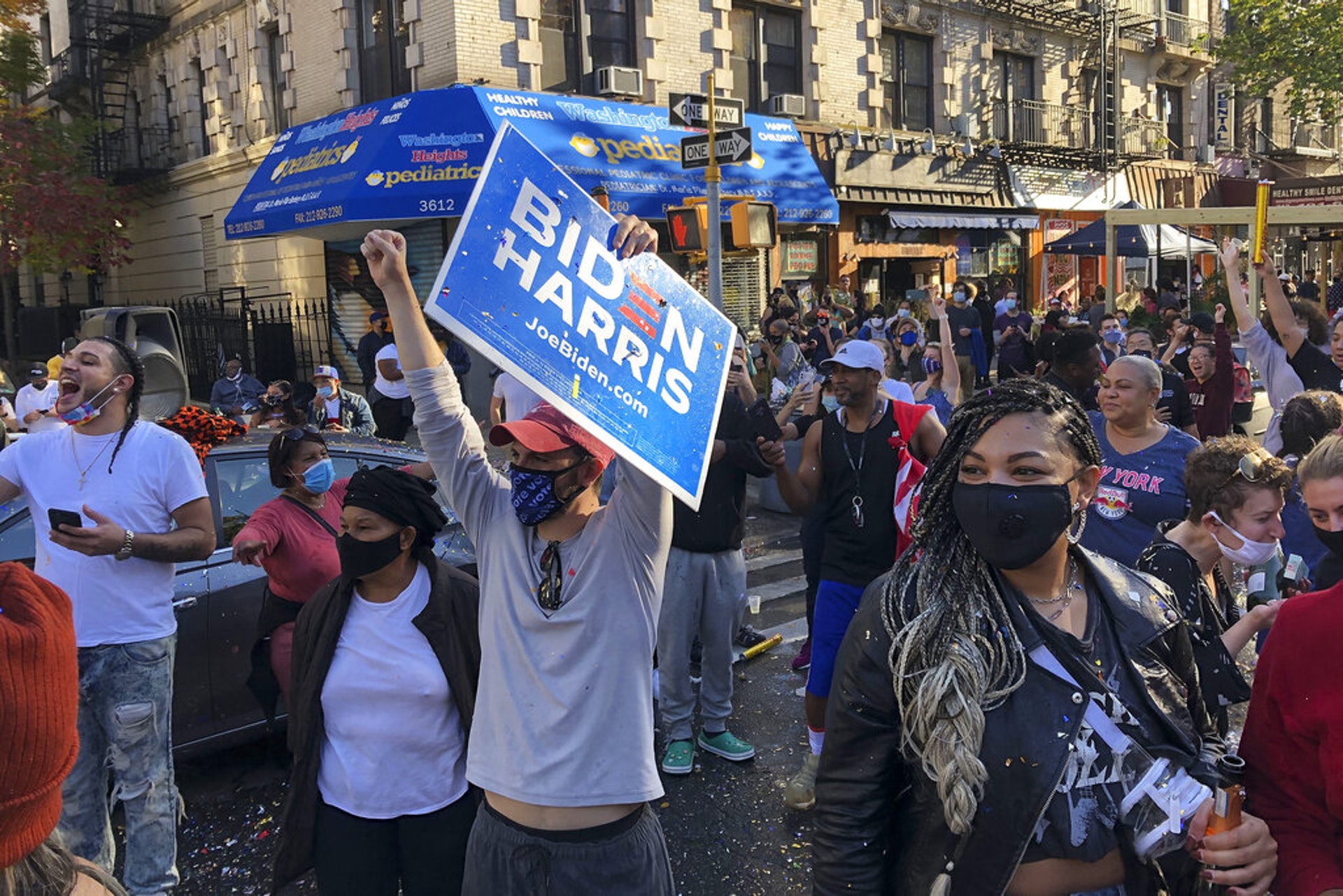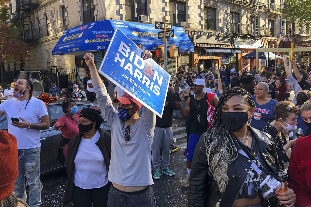 美國大選(US election):圖為美國紐約哈林區的拜登支持者走到街上慶祝,喜悅之情溢於言表。(AP)