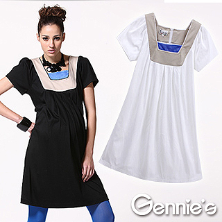 【Gennies奇妮】方領配色拼接春夏孕婦洋裝(兩色可選C1X07)